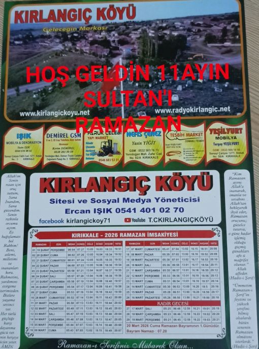 HAYIRLI RAMAZANLAR ![]() Kırlangıç köyü site ve sosyal medya yöneticisi olarak başta kırlangıç köyü adına,ve bizelere sponsor olan değerli köylülerimiz adına tüm islam aleminin hayırlı,huzurlu bir ramazan geçirmesini bu güzel ayda tutmuş olduğumuz oruçların oldugumuz duaların kabul olmasını temenni ederim. ![]() |
